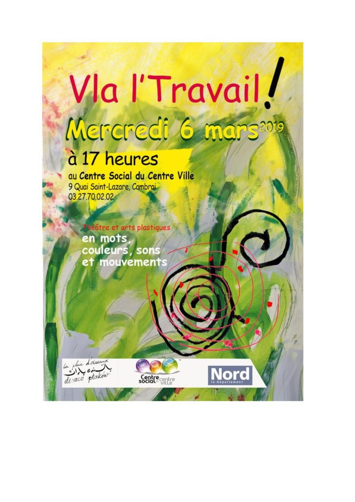 Restitution Théâtre et arts plastiques ( en mots, couleurs,sons et mouvements) . Le Mercredi 6 Mars 2019 , à 17h00 au centre social . Informations et renseignements au 03/27/70/02/02.