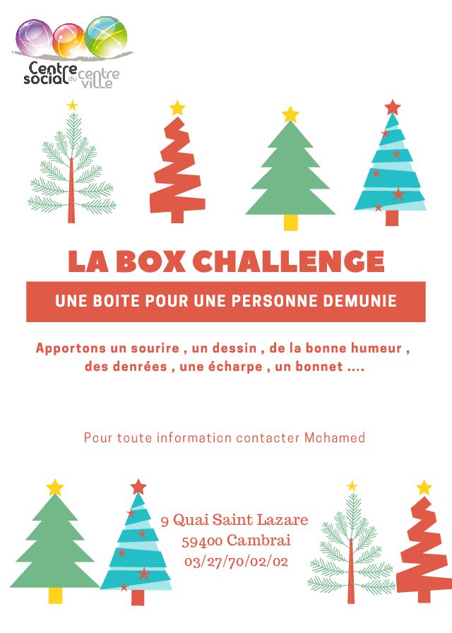 Une boite pour une personne démunie !!!! Apportons un sourire , un dessin , de la bonne humeur , des denrées , une écharpe , une bonnet … Pour toute information contacter Mohamed au 03/27/70/02/02.